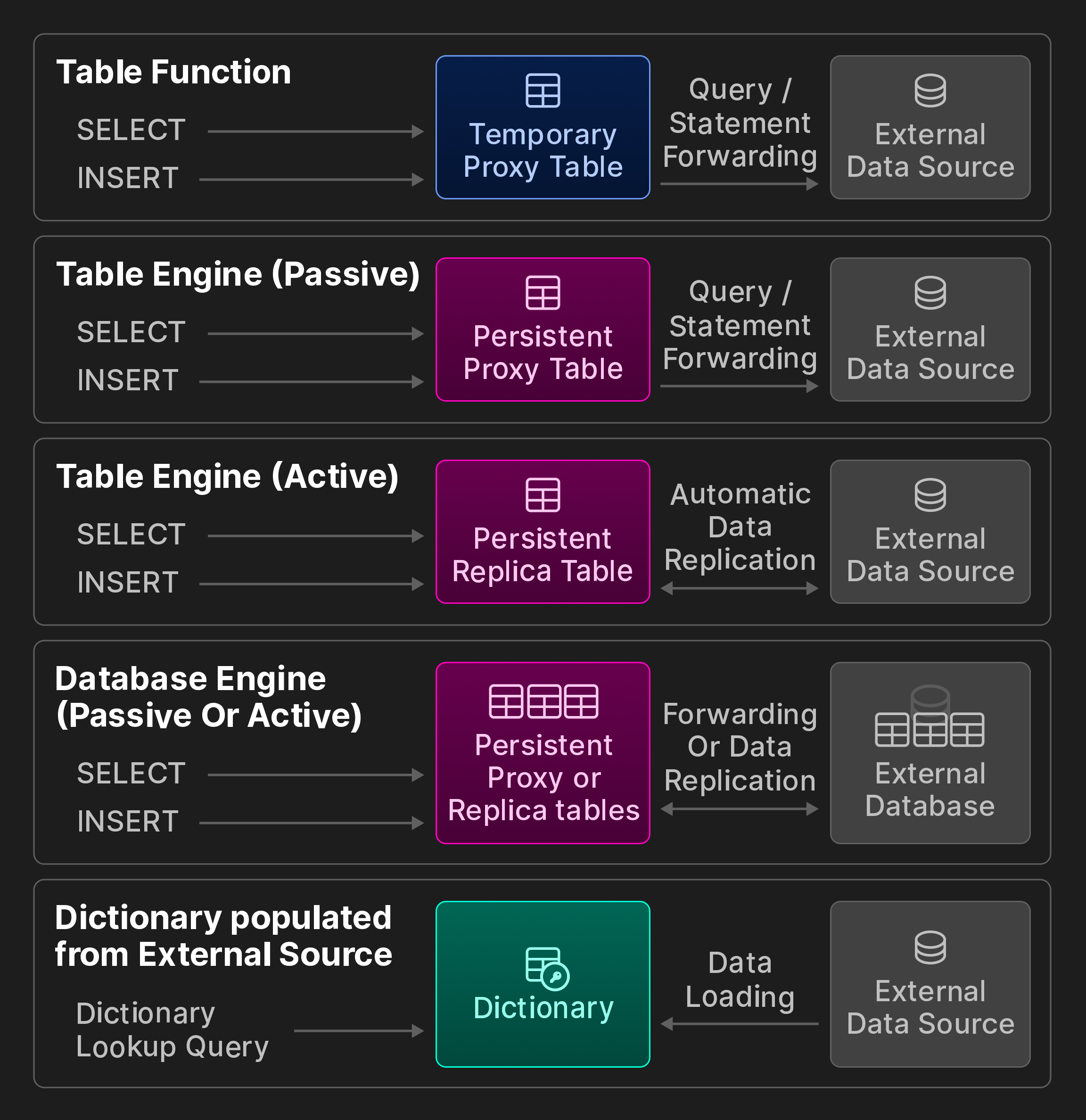 Третья категория движков таблиц - это виртуальные движки таблиц для двустороннего обмена данными с внешними системами, такими как реляционные базы данных (например, PostgreSQL, MySQL), системы публикации/подписки (например, Kafka, RabbitMQ [24]), или хранилища ключ/значение (например, Redis). Виртуальные движки также могут взаимодействовать с озерами данных (например, Iceberg, DeltaLake, Hudi [36]) или файлами в объектных хранилищах (например, AWS S3, Google GCP).