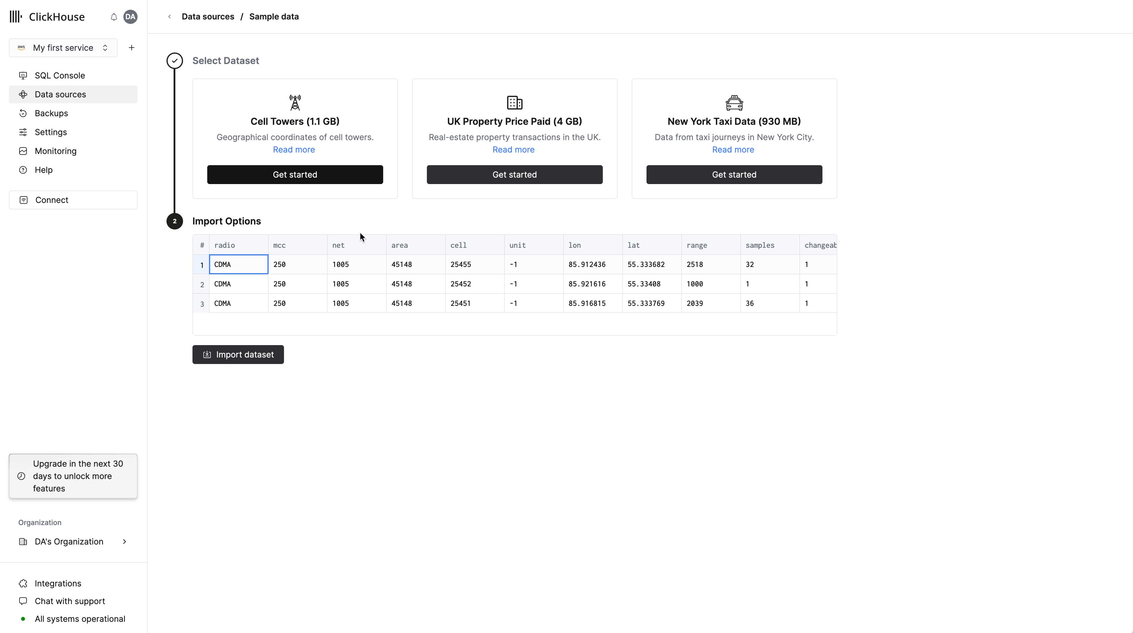 ClickHouse Cloud предоставляет удобный способ загрузки этого набора данных с S3. Войдите в свою организацию ClickHouse Cloud или создайте бесплатную пробную версию на ClickHouse.cloud.