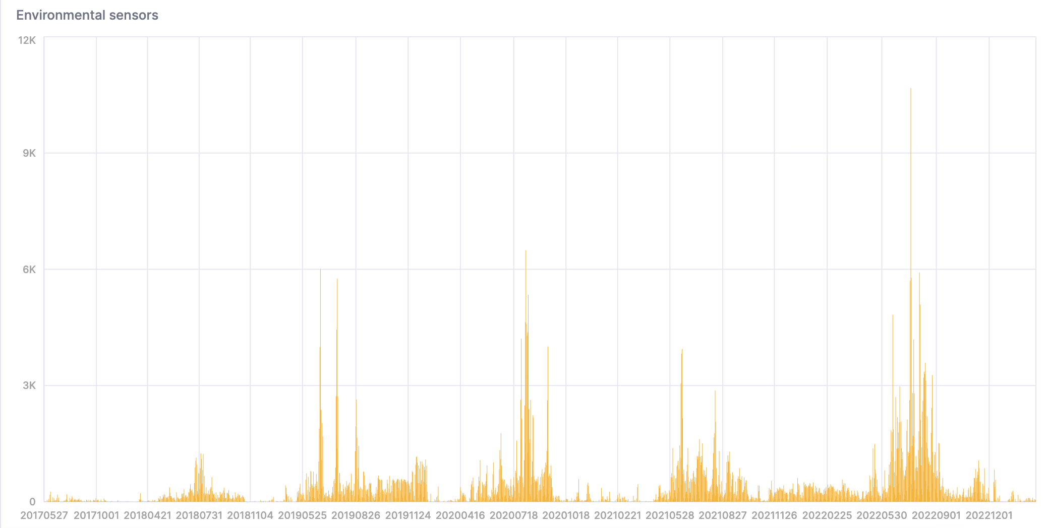 - Давайте проанализируем данные, теперь когда они в ClickHouse. Обратите внимание, что количество данных увеличивается с течением времени по мере разворачивания новых датчиков: